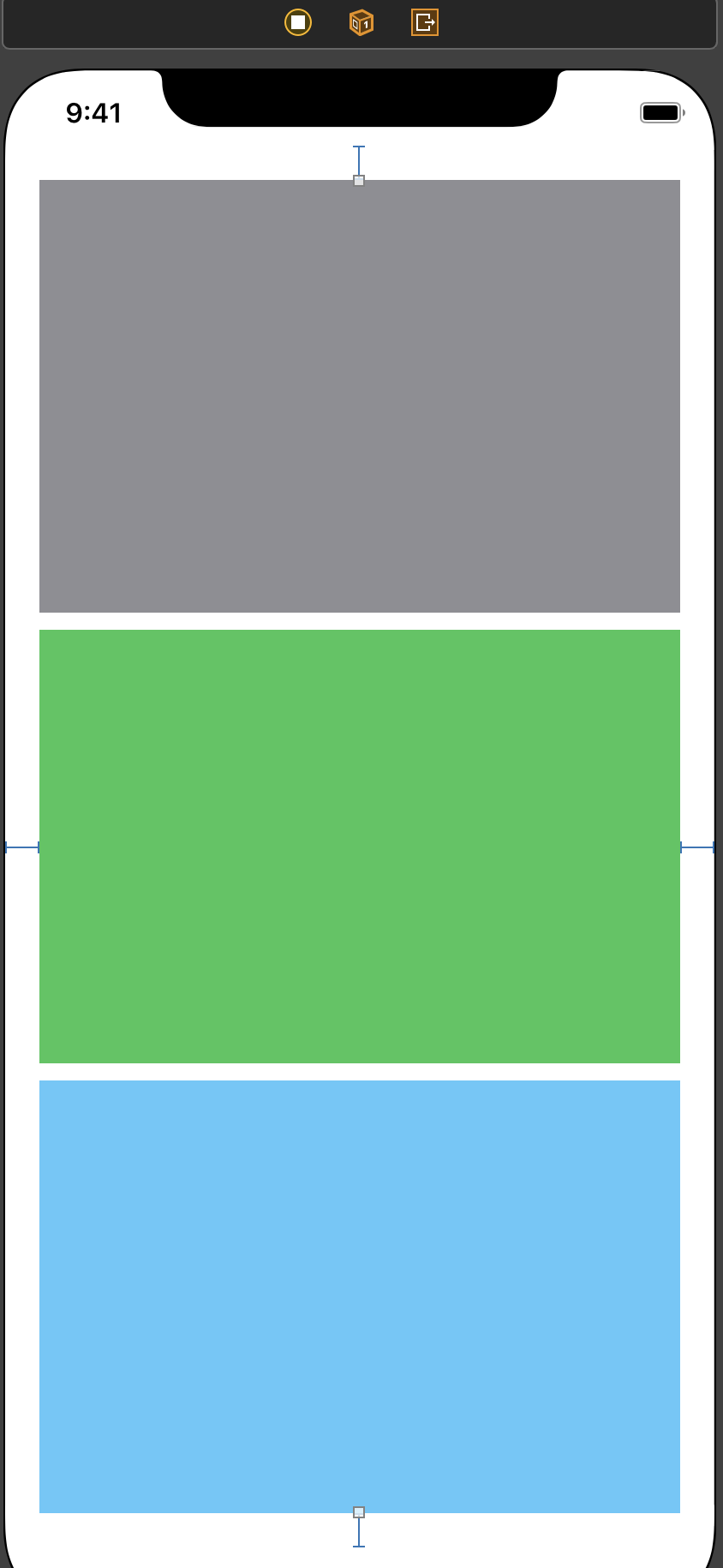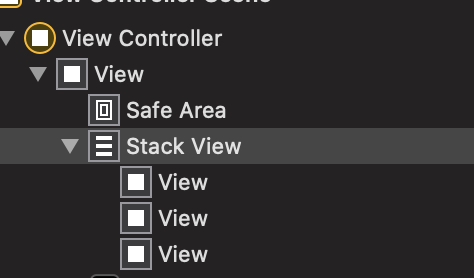 StackView에 View를 넣어준 후, View들을 바로 아래계층에 나란히 배치해줍니다. 저는 Vertical Stack View 아래에 View 3개를 배치해주었습니다.