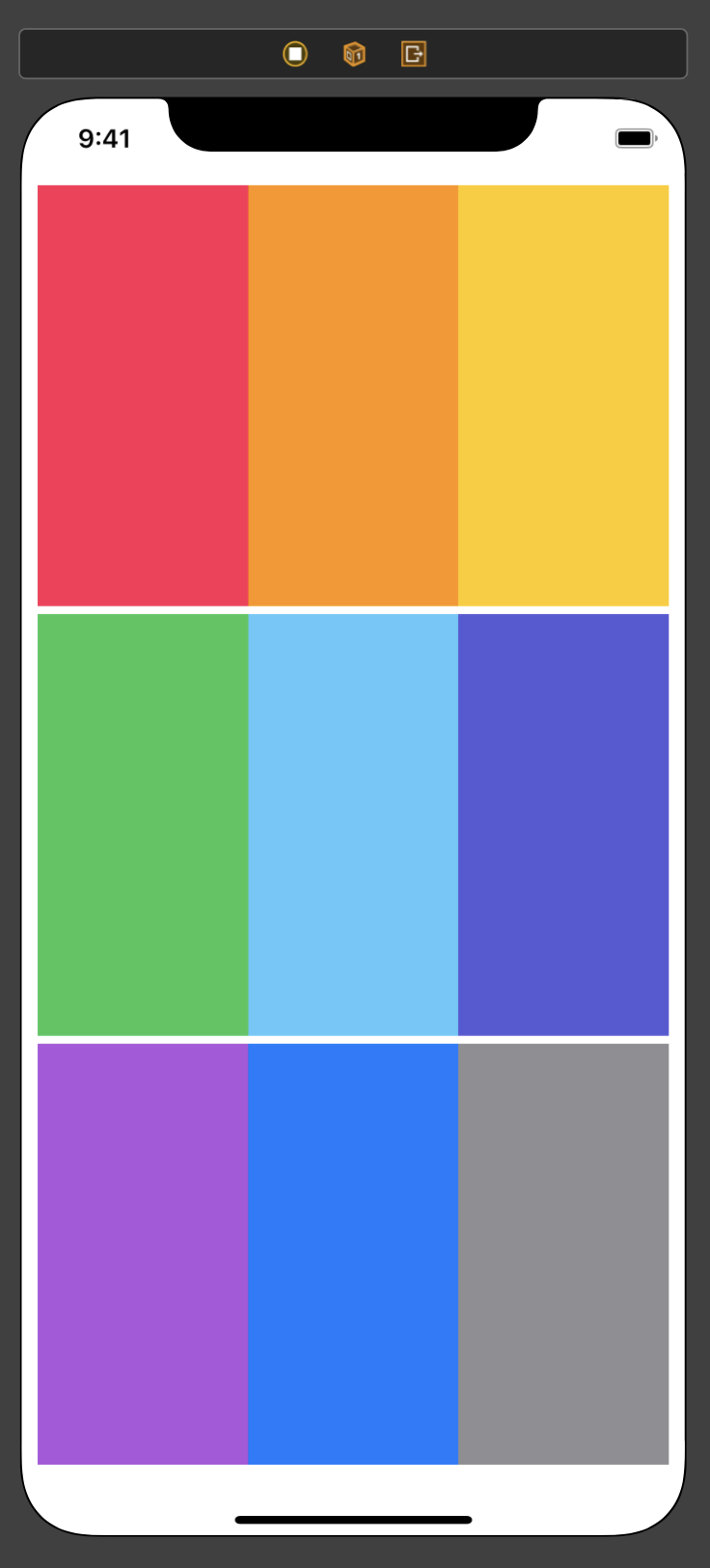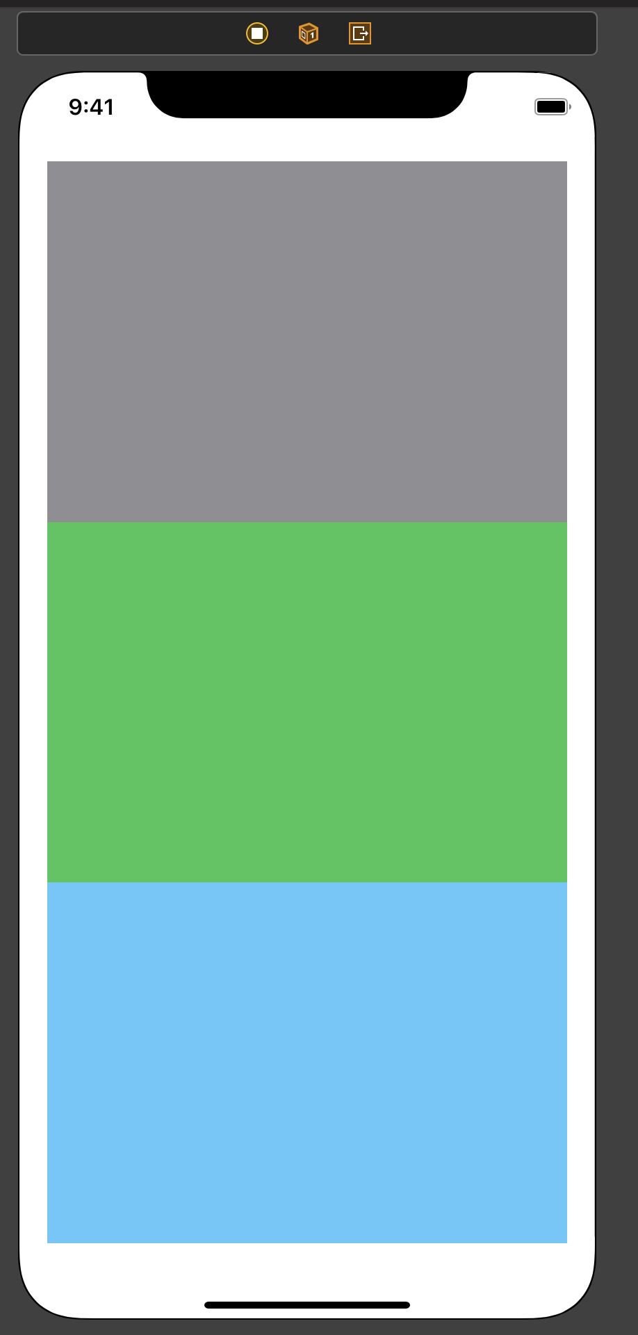 2. 배치된 하나의 Horizontal Stackview는 다시 3개의 view로 나뉘고, 각 view 마다 background 색을 다르게 지정해줍니다.