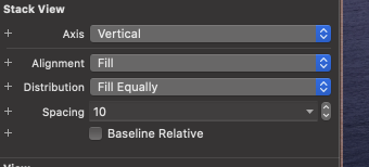 View를 배치한 후, 다시 Stack View에 들어가보면 Inspector 창에 Distribution 이라는 항목을 볼 수 있습니다.