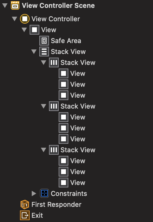 1. 먼저 구조를 크게 보면 크게 Vertical stack View가 있고, 내부에는 3개의 Horizontal Stackview가 세로로 배치됩니다.